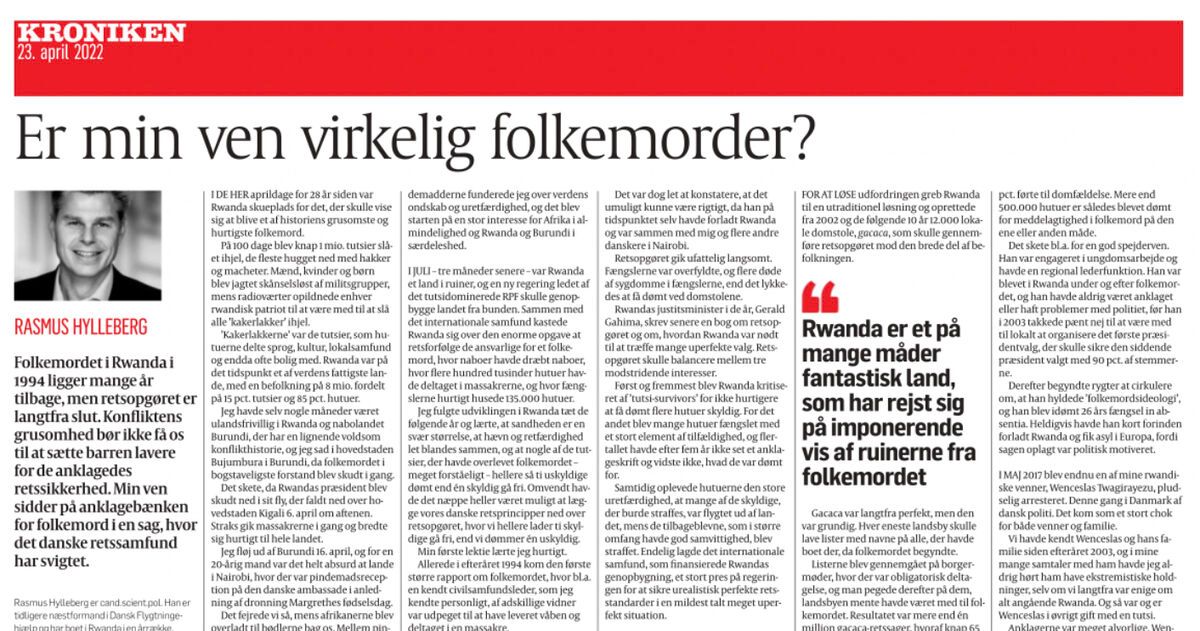 Dansk politikers beskyttelse af en folkedrabsmistænkt støtter straffrihed. Sagen om Wenceslas Twagirayezu.